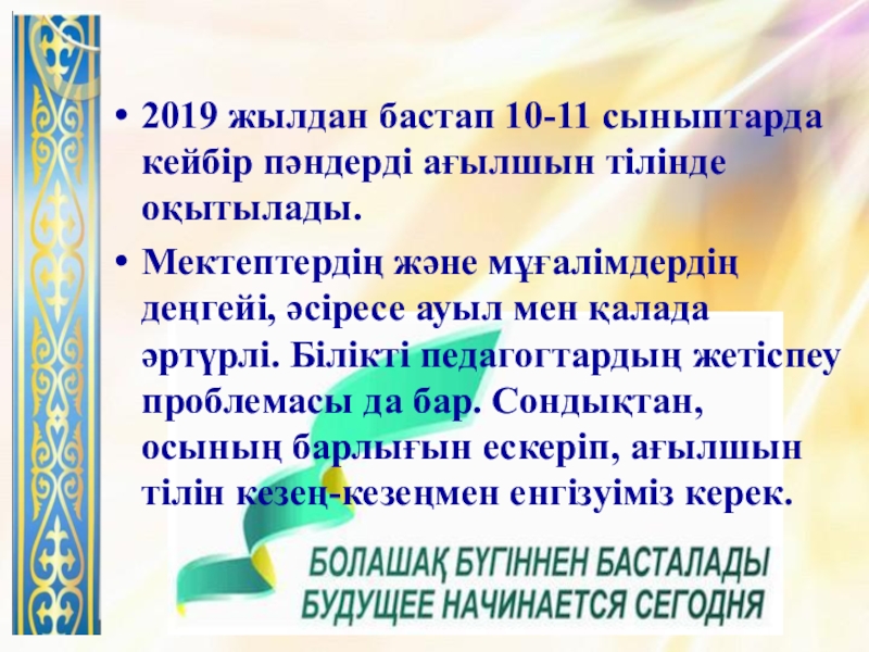 Слайд 222019 жылдан бастап 10-11 сыныптарда кейбір пәндерді ағылшын тілінде оқытылады.