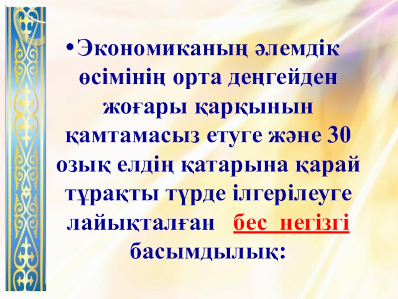 Слайд 7Экономиканың әлемдік өсімінің орта деңгейден жоғары қарқынын қамтамасыз етуге және 30