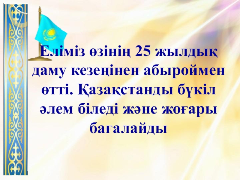 Слайд 3Еліміз өзінің 25 жылдық даму кезеңінен абыроймен өтті. Қазақстанды бүкіл әлем