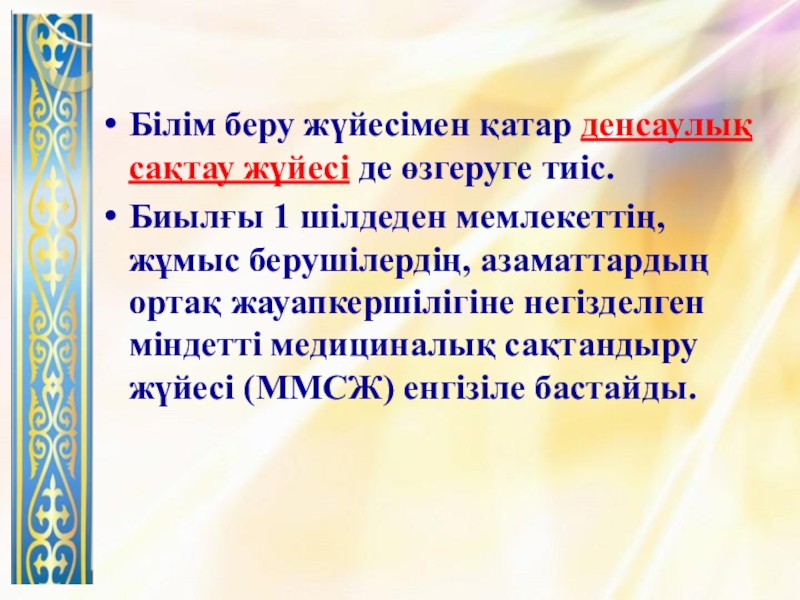 Слайд 24Білім беру жүйесімен қатар денсаулық сақтау жүйесі де өзгеруге тиіс.