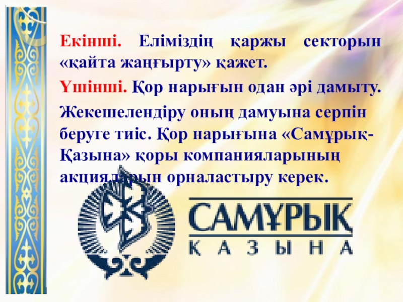 Слайд 17Екінші. Еліміздің қаржы секторын «қайта жаңғырту» қажет.