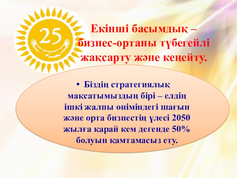 орта бизнестің үлесі 2050 жылға қарай кем дегенде 50% болуын қамтамасыз ету.
