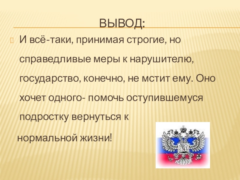 ВЫВОД:И всё-таки, принимая строгие, но справедливые меры к нарушителю, государство, конечно, не мстит ему. Оно хочет одного-