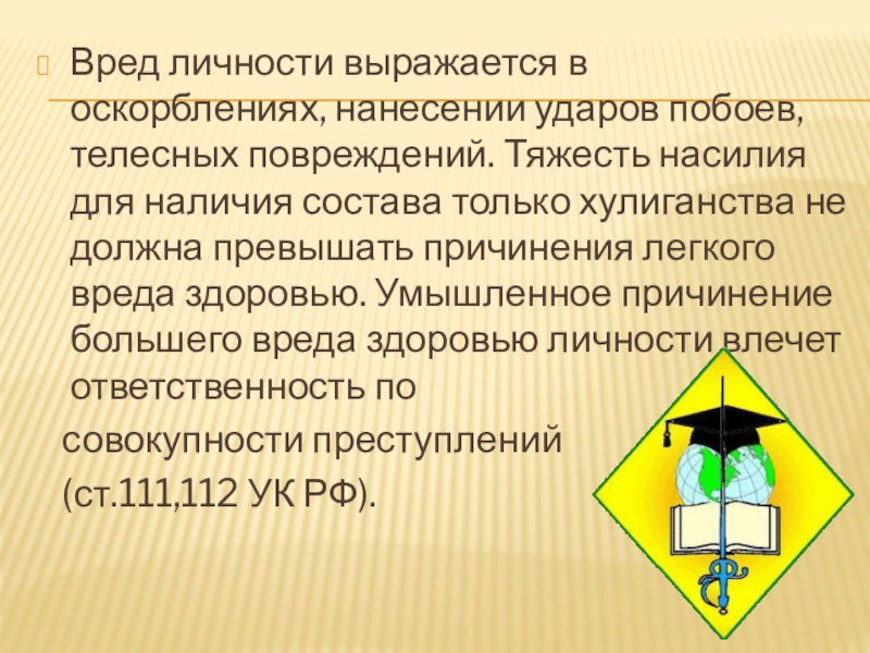 Слайд 8Вред личности выражается в оскорблениях, нанесении ударов побоев, телесных повреждений. Тяжесть