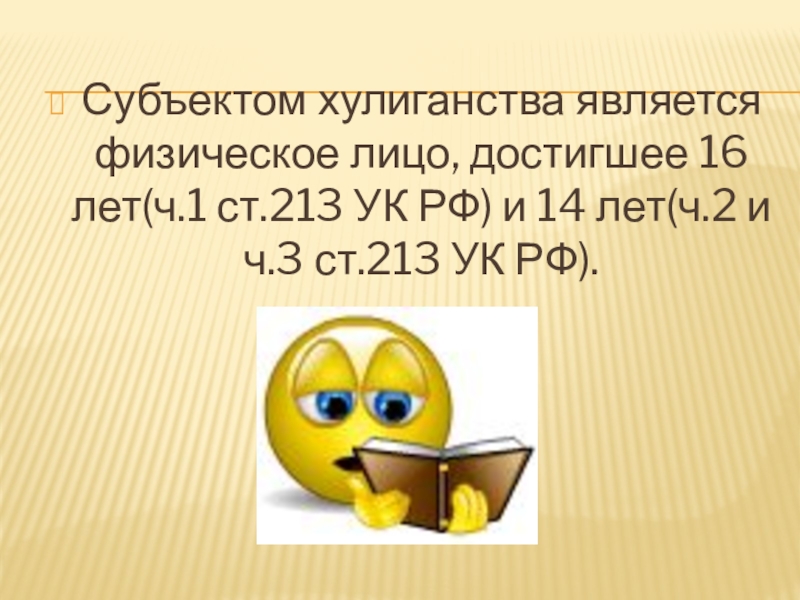 Слайд 9Субъектом хулиганства является физическое лицо, достигшее 16 лет(ч.1 ст.213 УК РФ)