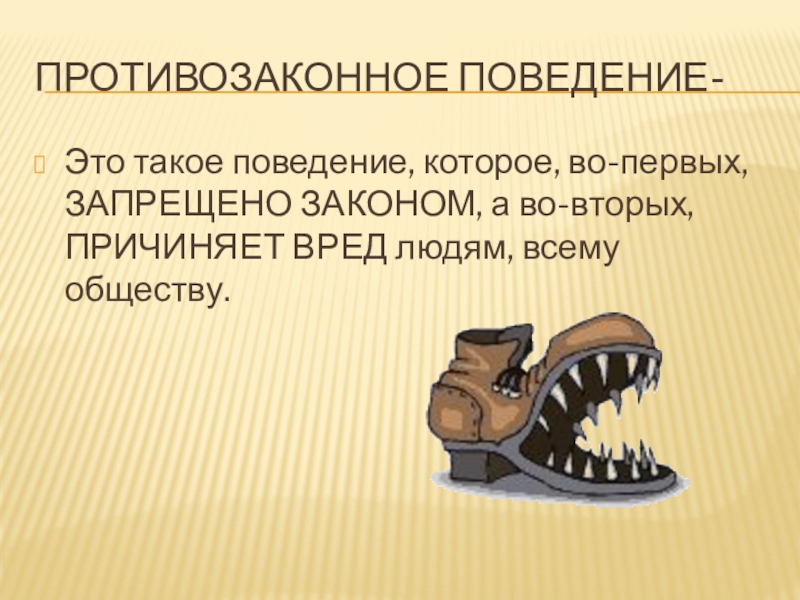 Противозаконное поведение-Это такое поведение, которое, во-первых, ЗАПРЕЩЕНО ЗАКОНОМ, а во-вторых, ПРИЧИНЯЕТ ВРЕД людям, всему обществу.