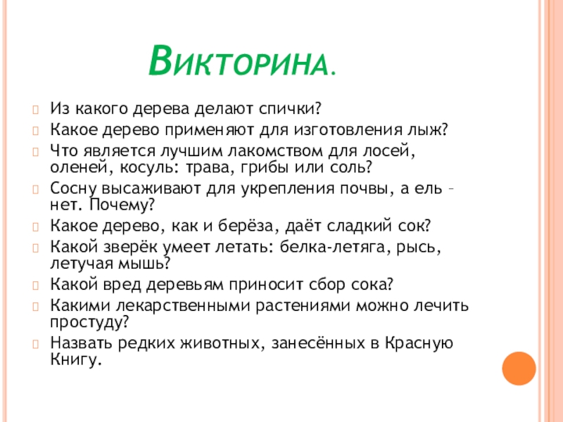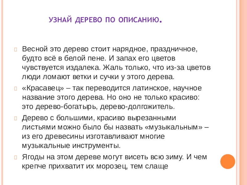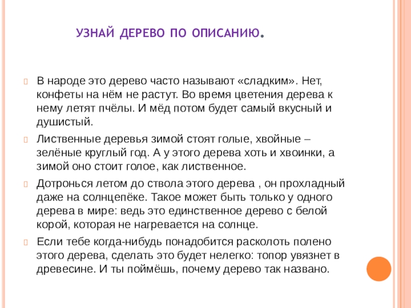Дуб: Мощь и величественная красота дуба привлекает всех. Корни его уходят глубоко в землю, и поэтому ему не страшны никакие бури. В старину дуб шёл на строительство кораблей. Сейчас из древесины дуба делают мебель, паркет, используют в вагоностроении судостроении.