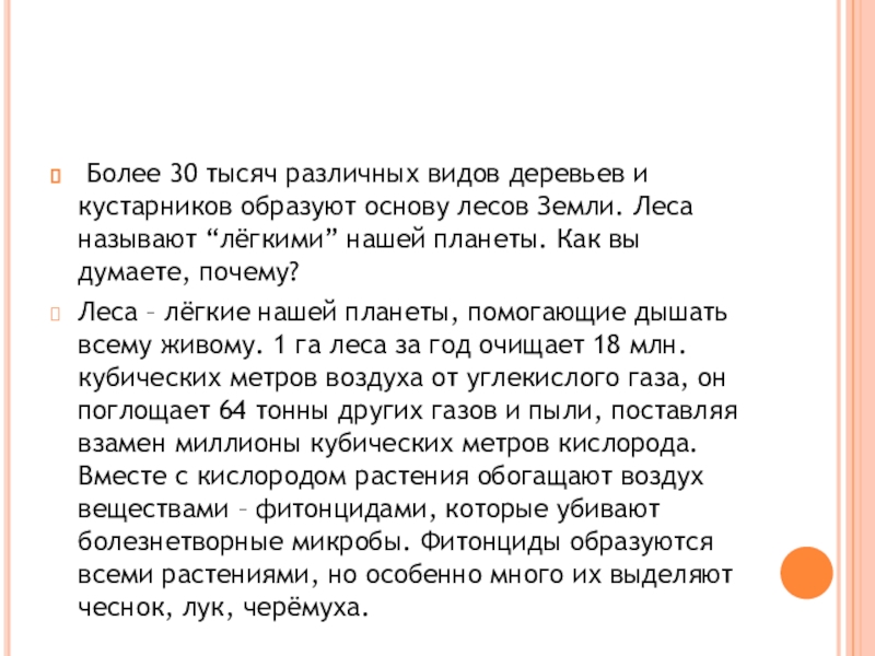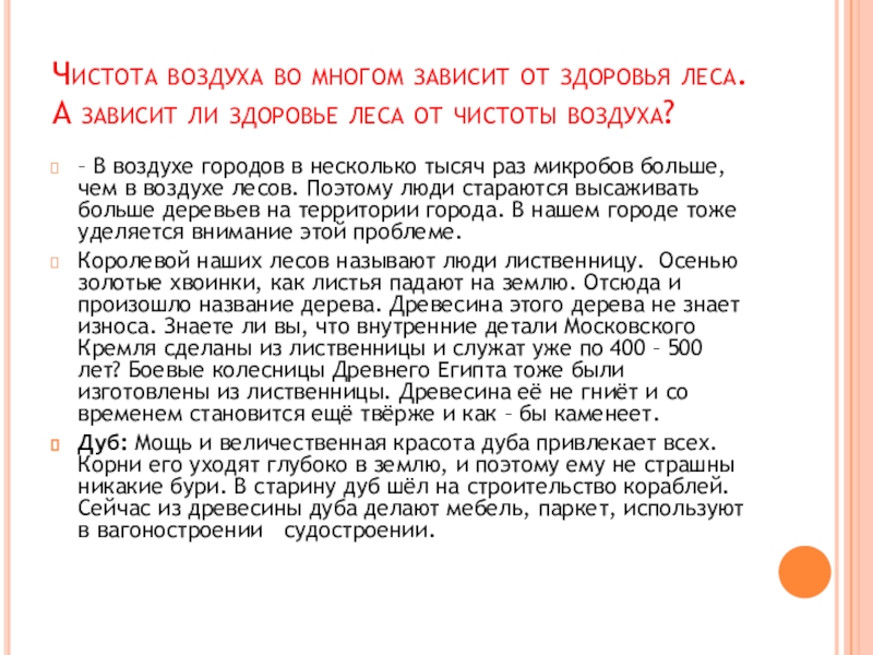 – В воздухе городов в несколько тысяч раз микробов больше, чем в воздухе лесов. Поэтому люди стараются высаживать больше деревьев на территории города. В нашем городе тоже уделяется внимание этой проблеме.