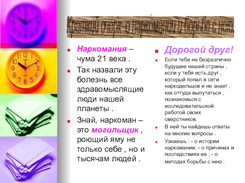 Узнаешь : - о истории наркомании; - о причинах и последствиях ее ; - о методах борьбы с нею .