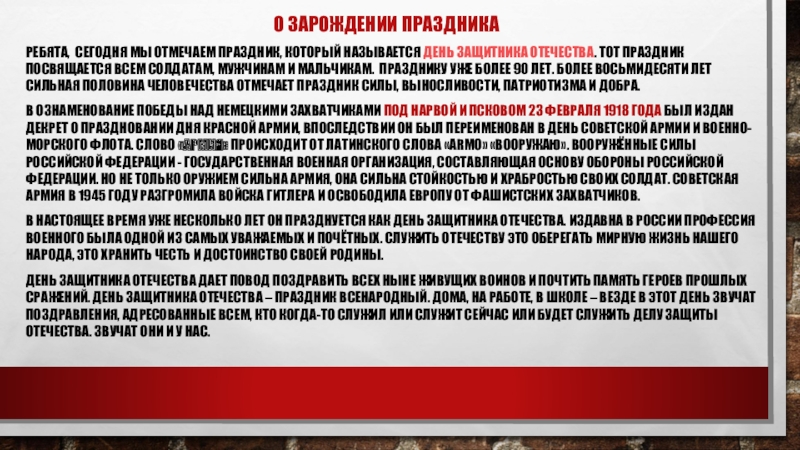 В ознаменование победы над немецкими захватчиками под Нарвой и Псковом 23 февраля 1918 года был издан декрет о праздновании Дня Красной Армии, впоследствии он был переименован в День Советской Армии и Военно-Морского Флота. Слово «армия» происходит от латинского слова «armo» «вооружаю». Вооружённые Силы Российской Федерации - государственная военная организация, составляющая основу обороны Российской Федерации. Но не только оружием сильна армия, она сильна стойкостью и храбростью своих солдат. Советская Армия в 1945 году разгромила войска Гитлера и освободила Европу от фашистских захватчиков.