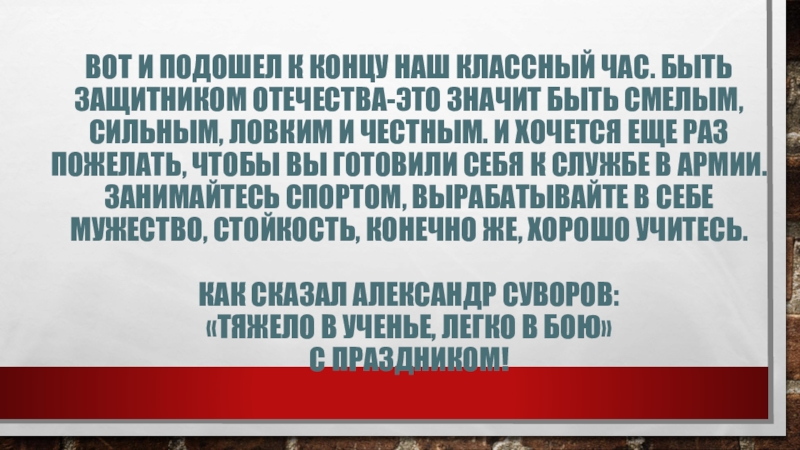 значит быть смелым, сильным, ловким и честным. И хочется еще раз пожелать, чтобы вы готовили себя к службе в армии. Занимайтесь спортом, вырабатывайте в себе мужество, стойкость, конечно же, хорошо учитесь. Как сказал Александр Суворов: «Тяжело в ученье, легко в бою» С праздником!