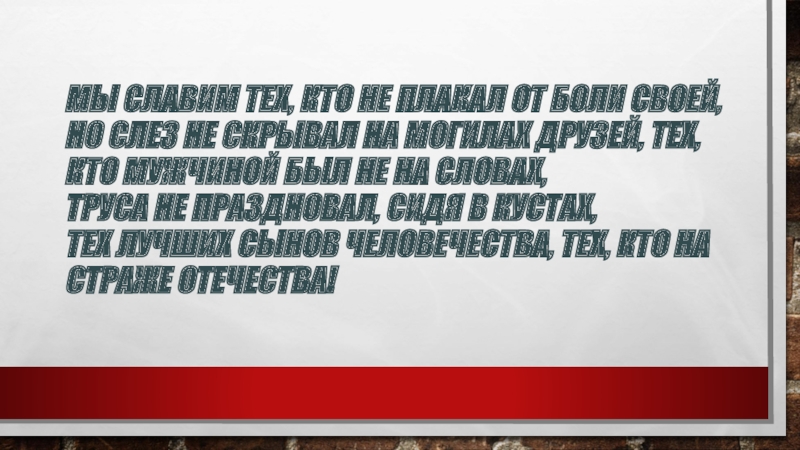 не скрывал На могилах друзей, Тех, кто мужчиной был Не на словах, Труса не праздновал, Сидя в кустах, Тех лучших Сынов человечества, Тех, кто на страже Отечества!