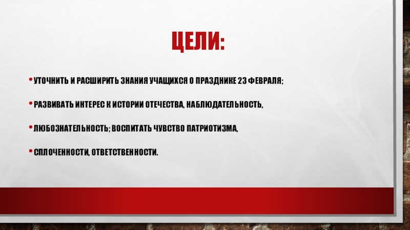 уточнить и расширить знания учащихся о празднике 23 февраля;