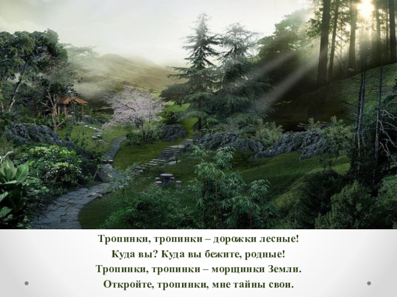 Тропинки, тропинки – дорожки лесные!Куда вы? Куда вы бежите, родные!Тропинки, тропинки – морщинки Земли.Откройте, тропинки, мне тайны