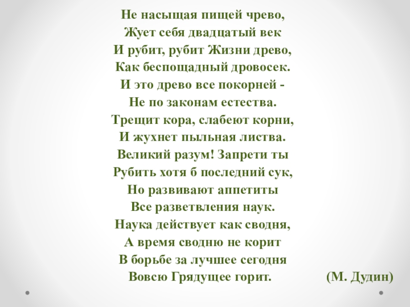 Не насыщая пищей чрево,Жует себя двадцатый векИ рубит, рубит Жизни древо,Как беспощадный дровосек.И это древо все покорней