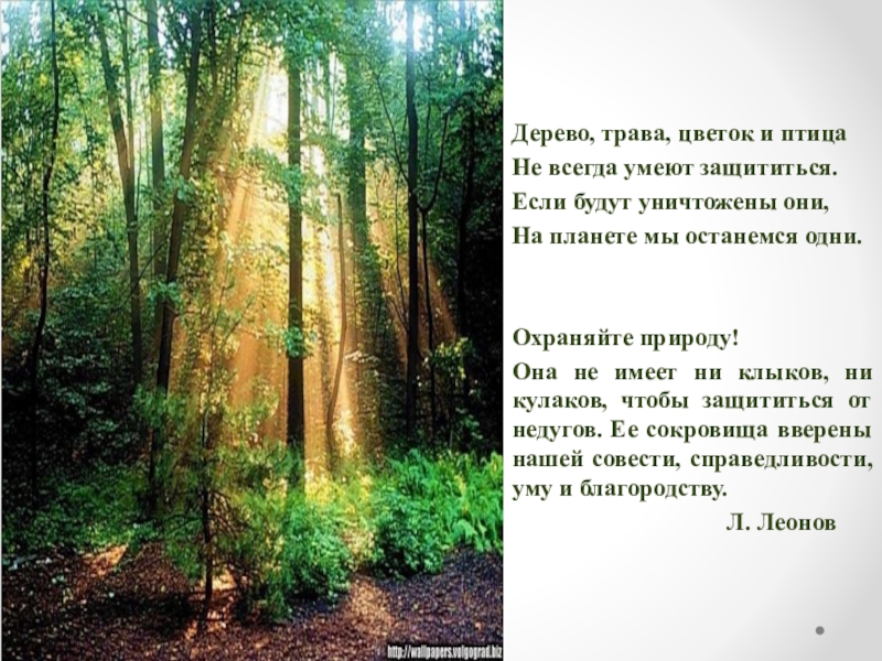Дерево, трава, цветок и птица Не всегда умеют защититься.Если будут уничтожены они, На планете мы останемся одни.Охраняйте природу! Она не имеет ни клыков, ни кулаков, чтобы защититься от недугов. Ее сокровища вверены нашей совести, справедливости, уму