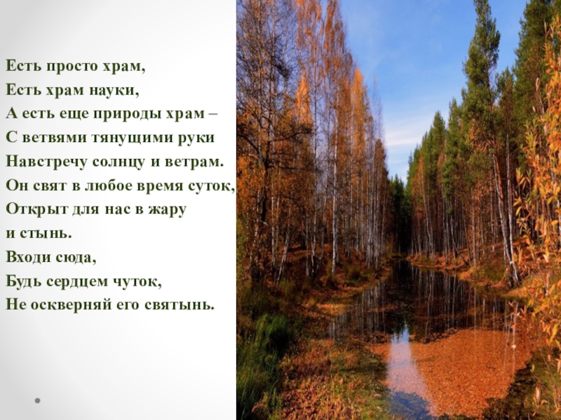 Есть просто храм, Есть храм науки, А есть еще природы храм – С ветвями тянущими руки Навстречу
