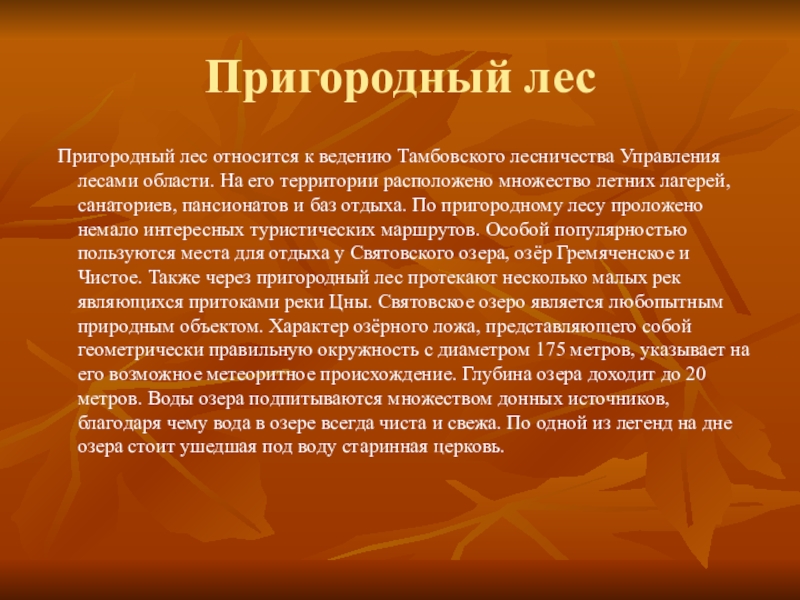 области. На его территории расположено множество летних лагерей, санаториев, пансионатов и баз отдыха. По пригородному лесу проложено немало интересных туристических маршрутов. Особой популярностью пользуются места для отдыха у Святовского озера, озёр Гремяченское и Чистое. Также через пригородный лес протекают несколько малых рек являющихся притоками реки Цны. Святовское озеро является любопытным природным объектом. Характер озёрного ложа, представляющего собой геометрически правильную окружность с диаметром 175 метров, указывает на его возможное метеоритное происхождение. Глубина озера доходит до 20 метров. Воды озера подпитываются множеством донных источников, благодаря чему вода в озере всегда чиста и свежа. По одной из легенд на дне озера стоит ушедшая под воду старинная церковь.