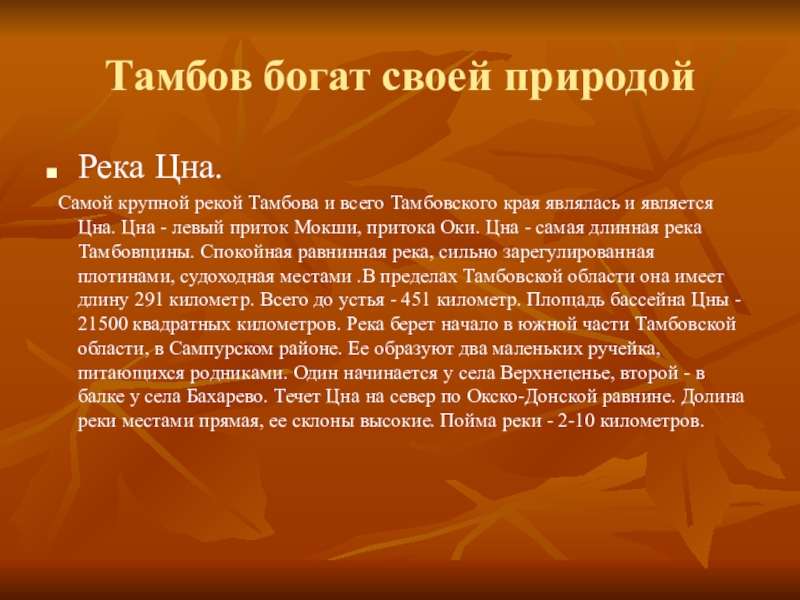 Тамбовского края являлась и является Цна. Цна - левый приток Мокши, притока Оки. Цна - самая длинная река Тамбовщины. Спокойная равнинная река, сильно зарегулированная плотинами, судоходная местами .В пределах Тамбовской области она имеет длину 291 километр. Всего до устья - 451 километр. Площадь бассейна Цны - 21500 квадратных километров. Река берет начало в южной части Тамбовской области, в Сампурском районе. Ее образуют два маленьких ручейка, питающихся родниками. Один начинается у села Верхнеценье, второй - в балке у села Бахарево. Течет Цна на север по Окско-Донской равнине. Долина реки местами прямая, ее склоны высокие. Пойма реки - 2-10 километров.