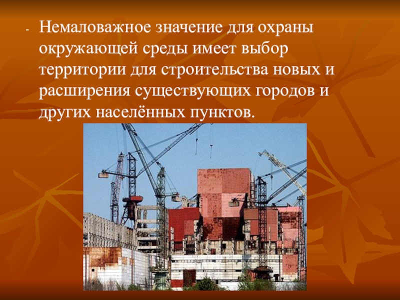 Слайд 13Немаловажное значение для охраны окружающей среды имеет выбор территории для строительства