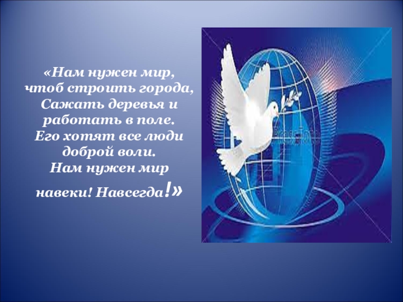Слайд 2 «Нам нужен мир, чтоб строить города, Сажать деревья и работать в