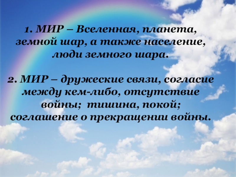 земного шара. 2. МИР – дружеские связи, согласие между кем-либо, отсутствие войны; тишина, покой; соглашение о прекращении войны.