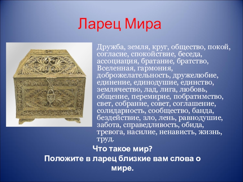 Ларец МираДружба, земля, круг, общество, покой, согласие, спокойствие, беседа, ассоциация, братание, братство, Вселенная, гармония, доброжелательность, дружелюбие, единение,