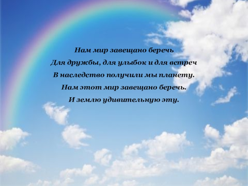 Нам мир завещано беречь Для дружбы, для улыбок и для встреч В наследство получили мы планету. Нам