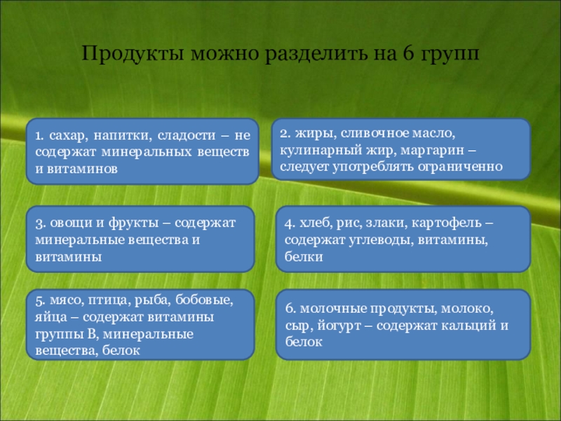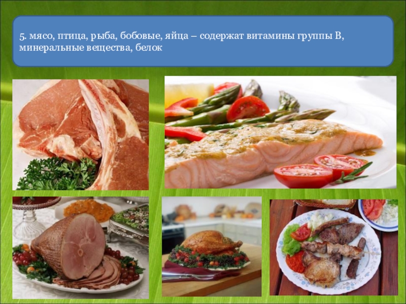 5. мясо, птица, рыба, бобовые, яйца – содержат витамины группы В, минеральные вещества, белок