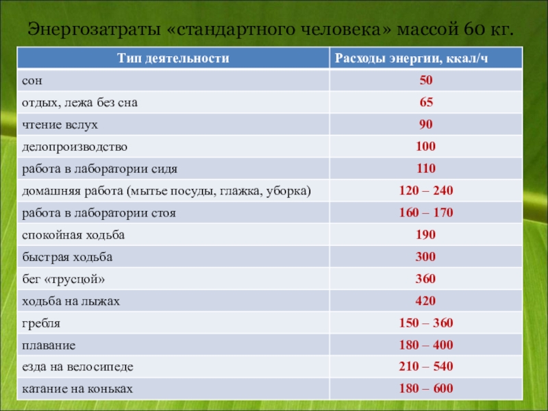 Энергетическая ценность суточного рациона питания должна соответствовать энергозатратам организма.