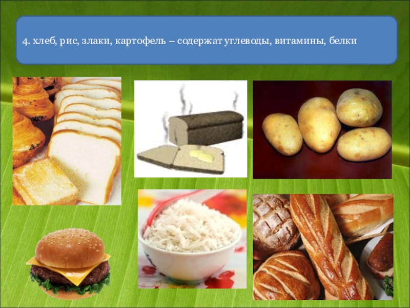 4. хлеб, рис, злаки, картофель – содержат углеводы, витамины, белки