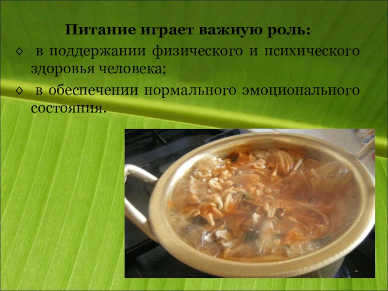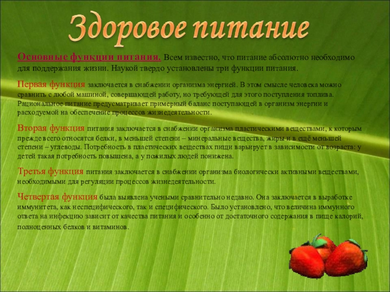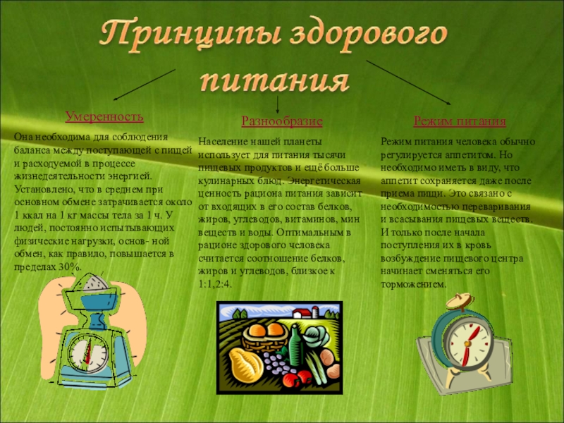 Население нашей планеты использует для питания тысячи пищевых продуктов и ещё больше кулинарных блюд. Энергетическая ценность рациона питания зависит от входящих в его состав белков, жиров, углеводов, витаминов, мин веществ и воды. Оптимальным в рационе здорового человека считается соотношение белков, жиров и углеводов, близкое к 1:1,2:4.