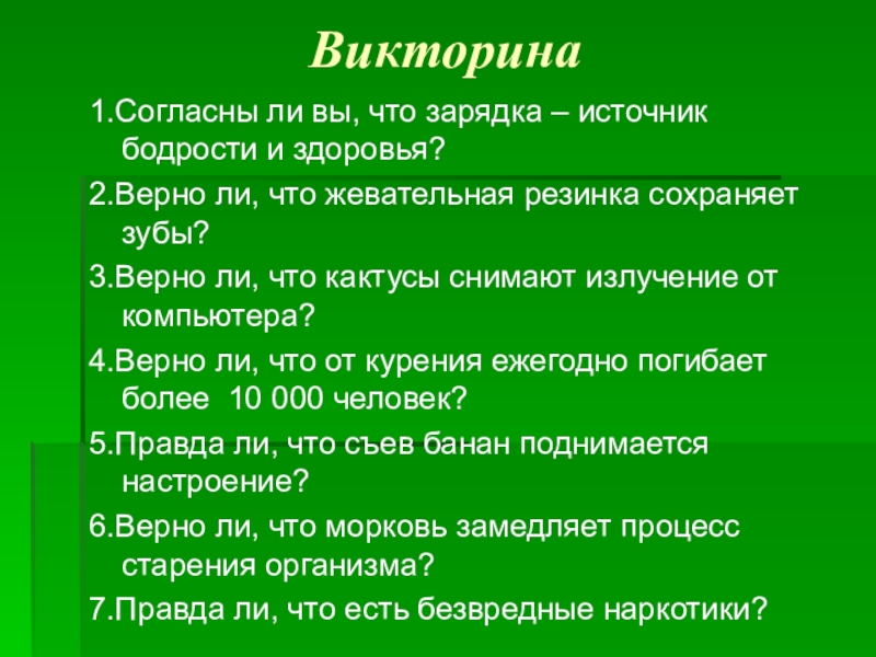 1.Согласны ли вы, что зарядка – источник бодрости и здоровья?