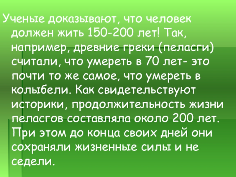 Слайд 6Ученые доказывают, что человек должен жить 150-200 лет! Так, например, древние