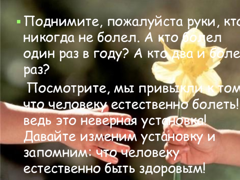 Слайд 4Поднимите, пожалуйста руки, кто никогда не болел. А кто болел один