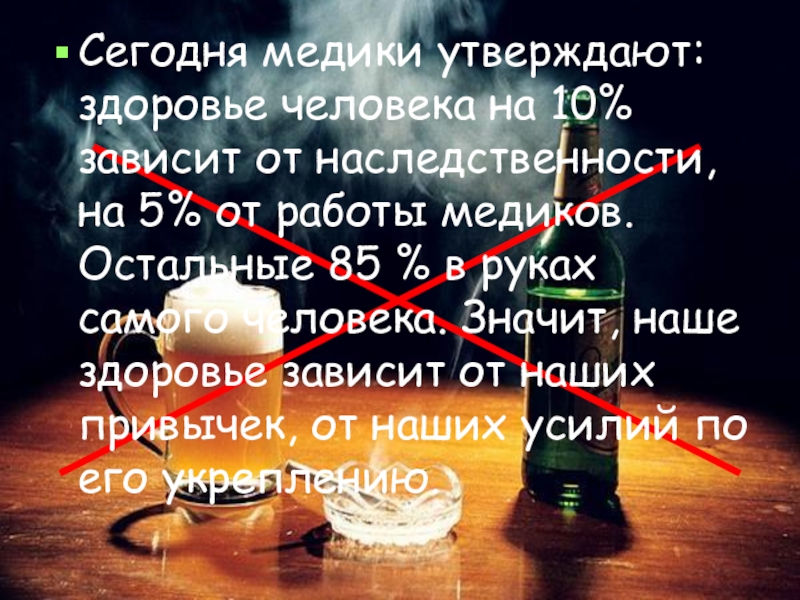Слайд 5Сегодня медики утверждают: здоровье человека на 10% зависит от наследственности, на