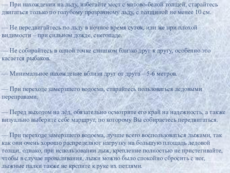 — При нахождении на льду, избегайте мест с матово-белой толщей, старайтесь двигаться только по голубому прозрачному льду,