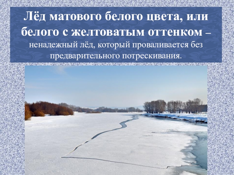 Слайд 8Лёд матового белого цвета, или белого с желтоватым оттенком – ненадежный