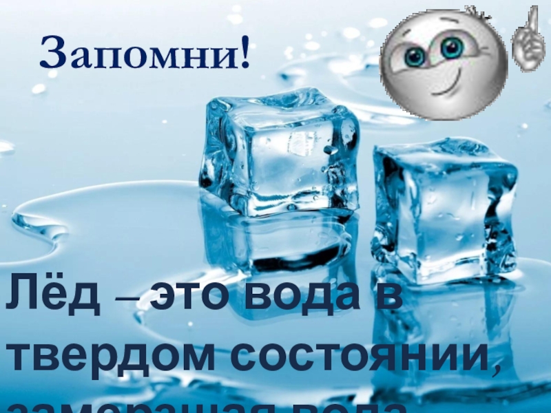 Запомни!Лёд – это вода в твердом состоянии, замерзшая вода.