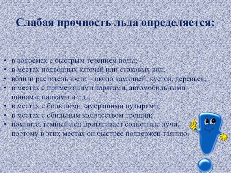 Слайд 4Толщина льда, для безопасного пребывания на нем, составляет минимум – 10