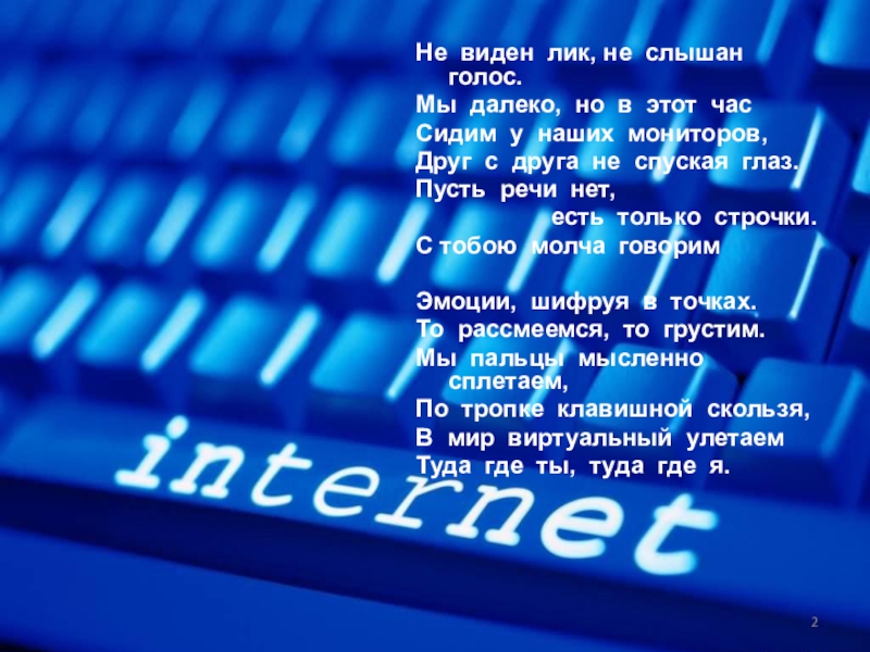 Не виден лик, не слышан голос.Мы далеко, но в этот часСидим у наших мониторов,Друг с друга не спуская глаз.Пусть речи нет, есть только строчки.С тобою молча говорим Эмоции,