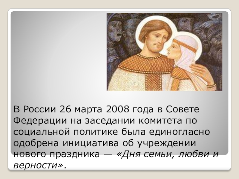 В России 26 марта 2008 года в Совете Федерации на заседании комитета по социальной политике была единогласно одобрена инициатива об учреждении нового праздника — «Дня семьи, любви и верности».