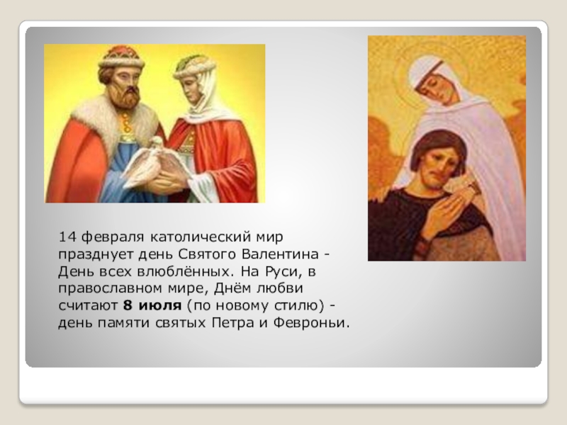 влюблённых. На Руси, в православном мире, Днём любви считают 8 июля (по новому стилю) - день памяти святых Петра и Февроньи.