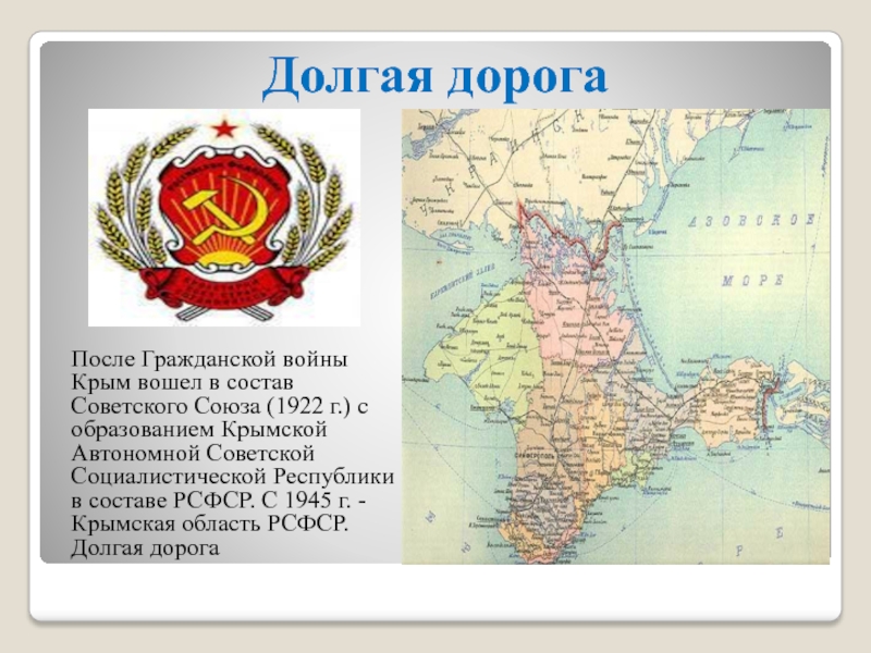 (1922 г.) с образованием Крымской Автономной Советской Социалистической Республики в составе РСФСР. С 1945 г. - Крымская область РСФСР.