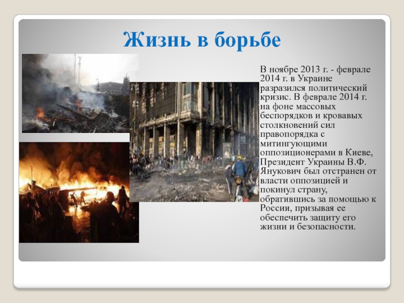 в Украине разразился политический кризис. В феврале 2014 г. на фоне массовых беспорядков и кровавых столкновений сил правопорядка с митингующими оппозиционерами в Киеве, Президент Украины В.Ф. Янукович был отстранен от власти оппозицией и покинул страну, обратившись за помощью к России, призывая ее обеспечить защиту его жизни и безопасности.