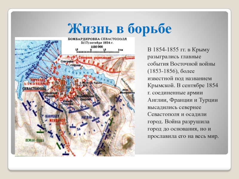 Восточной войны (1853-1856), более известной под названием Крымской. В сентябре 1854 г. соединенные армии Англии, Франции и Турции высадились севернее Севастополя и осадили город. Война разрушила город до основания, но и прославила его на весь мир.