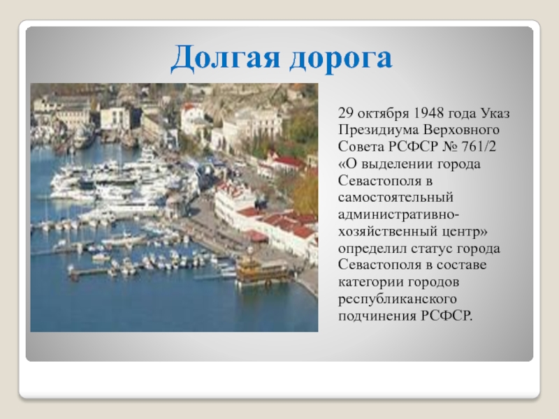 № 761/2 «О выделении города Севастополя в самостоятельный административно-хозяйственный центр» определил статус города Севастополя в составе категории городов республиканского подчинения РСФСР.
