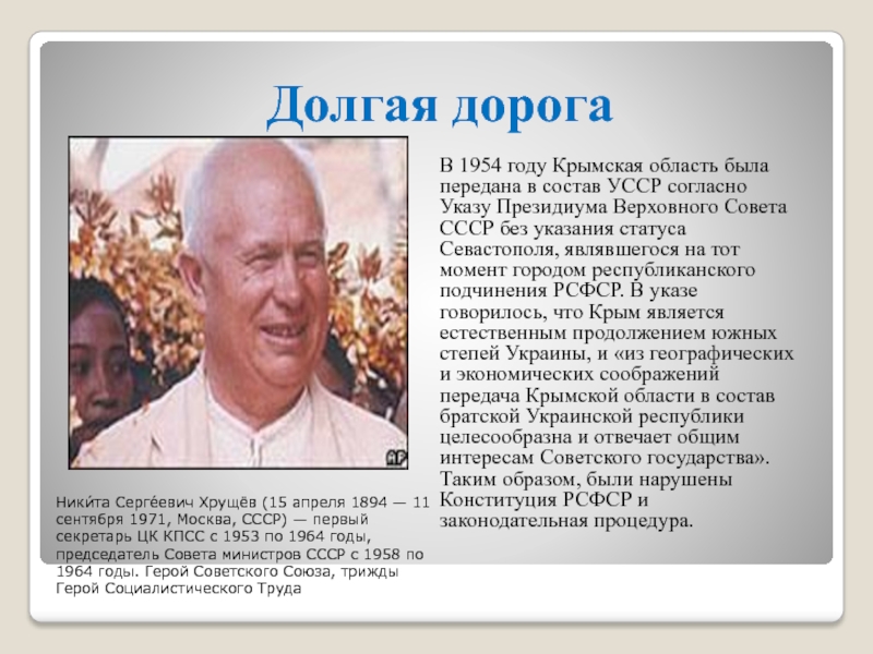Ники́та Серге́евич Хрущёв (15 апреля 1894 — 11 сентября 1971, Москва, СССР) — первый секретарь ЦК КПСС с 1953 по 1964 годы, председатель Совета министров СССР с 1958 по 1964 годы. Герой Советского Союза, трижды Герой Социалистического Труда
