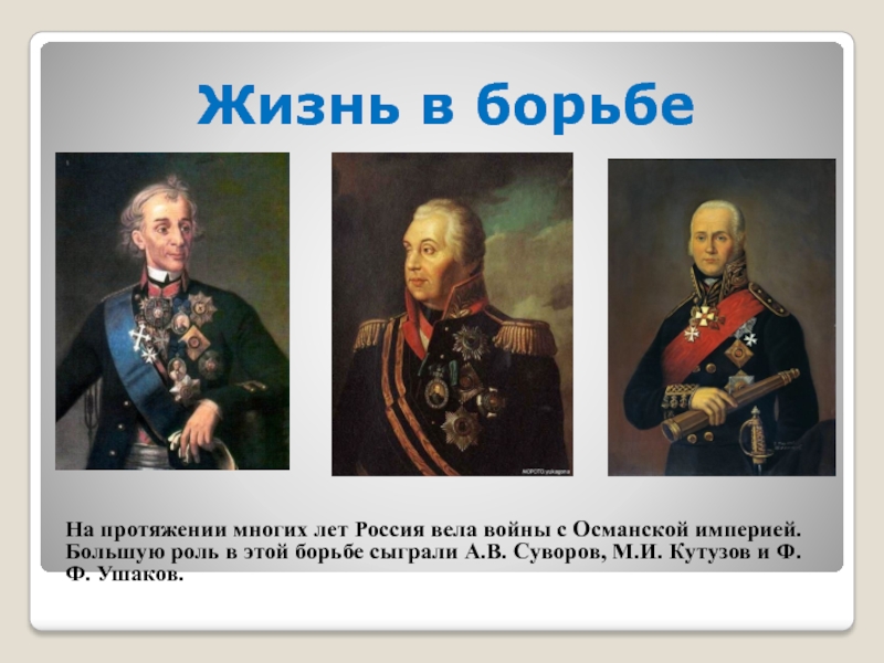 Османской империей. Большую роль в этой борьбе сыграли А.В. Суворов, М.И. Кутузов и Ф.Ф. Ушаков.