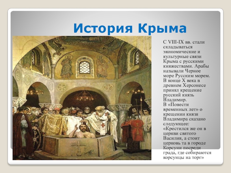 Крыма с русскими княжествами. Арабы называли Черное море Русским морем. В конце Х века в древнем Херсонесе принял крещение русский князь Владимир.